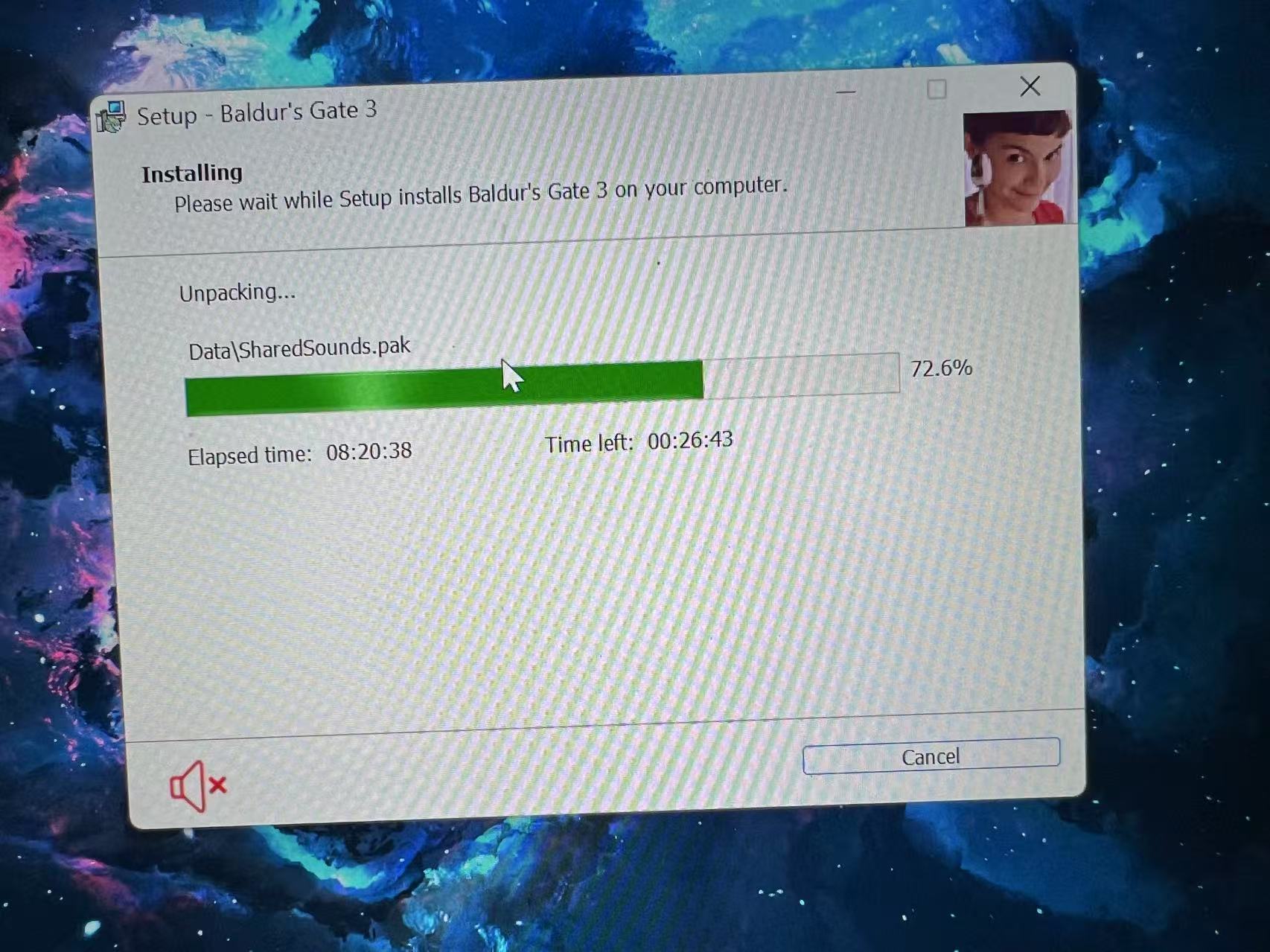 安装到72.6%的时候就不行了,一直停留在那,显示是unpacking sounds.pak,有人知道是出了什么问题吗